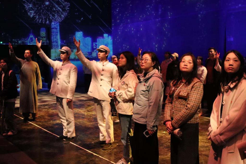 随后,全体学员齐聚“觉醒大剧场”,观看了以毛泽东、蔡和森等革命青年在湖南省立第一师范求学经历为蓝本创作的同名剧目。该剧通过多维艺术手法,生动再现了1913—1918年间青年毛泽东及其战友们“问志、寻志、立志”的壮阔历程,让学员们深受触动。