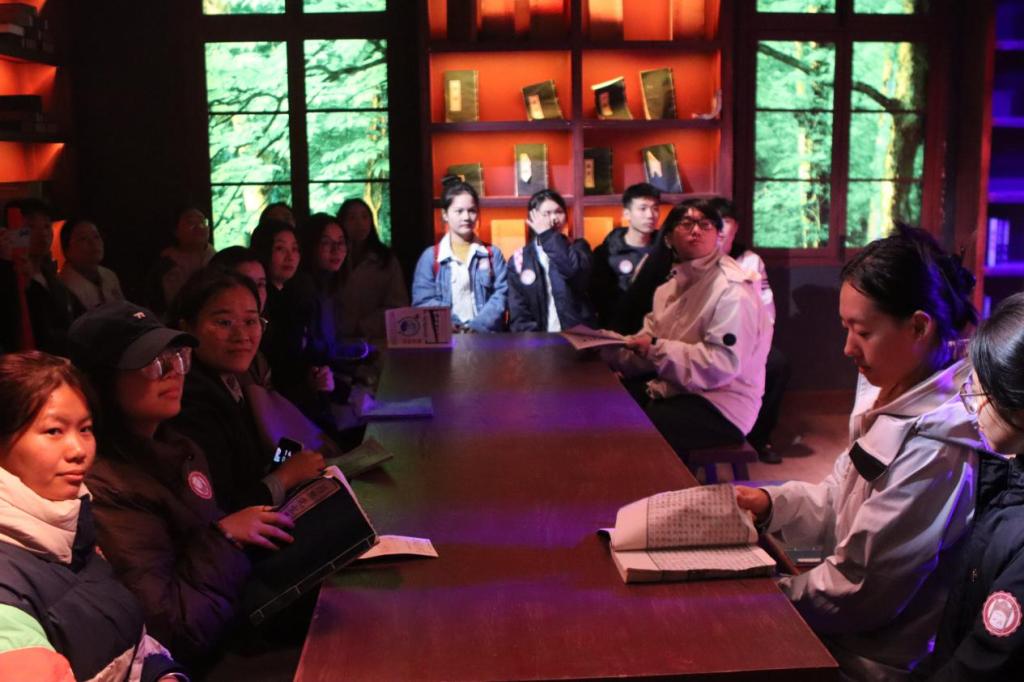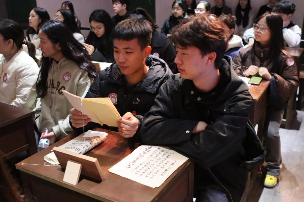 活动现场,学员们化身为“1913年湖南省立第一师范新生”,走进沉浸式情绪体验剧场《恰同学少年》。在“图书馆”“蔡和森家”等平行片场中,学员们与演员深度互动,参与“读书小组”研习《新青年》,亲身体验杨昌济先生的课堂。黑板上醒目的“立志”二字,仿佛将大家带回了那个激情燃烧的岁月。杨昌济先生引导学员们思考个人理想,探讨如何改变民众的困厄处境,学员们则齐声朗诵梁启超的《少年中国说》,在五感交融的氛围中,真切感受到了百年前新青年的热血情怀与理想抱负。