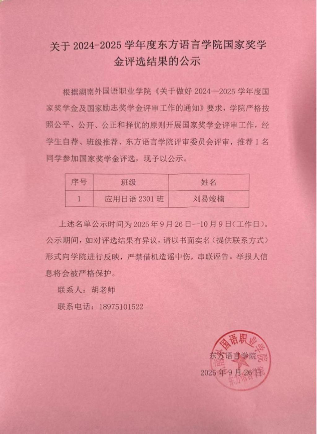 根据湖南外国语职业学院《关于做好2024—2025学年度国家奖学金及国家励志奖学金评审工作的通知》要求,东方语言学院严格遵循公平、公正、公开原则,经学生自荐、班级推荐、东方语言学院评审委员会评审,拟推荐刘易竣楠为东方语言学院2024-2025学年度国家奖学金候选人。