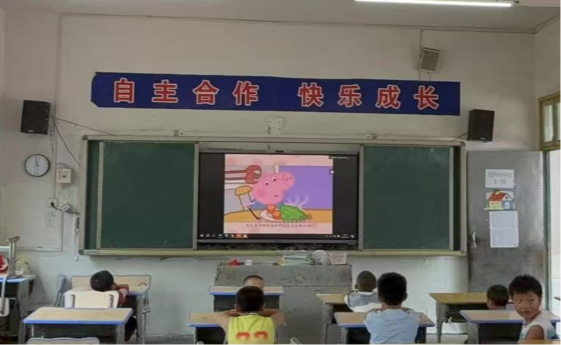 动画共赏:播放日语版《小猪佩奇》片段,孩子们模仿佩奇说“おはよう(早上好)”,还自发用苗语讨论:“佩奇家的雨靴和我们的一样红!”