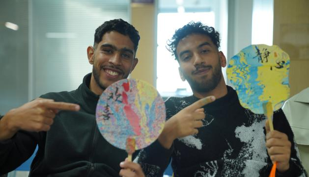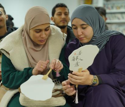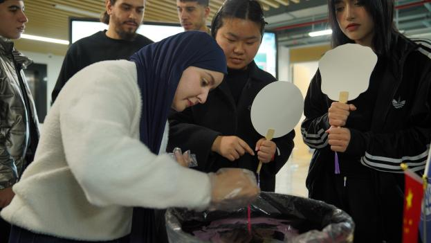 Students naturally infused their own cultural sensibilities into their creations. A student from North Africa employed ochre red and gold to outline a majestic desert sunset, while a participant from Central Asia juxtaposed shades of green and white, as if capturing the verdant slopes and snowy peaks of the Tianshan Mountains on the fan’s surface.