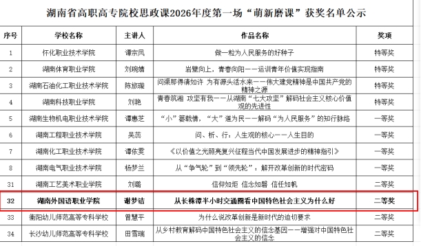近日,2026年首场湖南省高职高专院校思想政治理论课“骨干练兵、萌新磨课”竞赛活动圆满落幕。我校马克思主义学院教师田密密、谢梦洁凭借扎实的教学功底和出色的教学设计,分别在“骨干练兵”与“萌新磨课”两大竞赛单元中斩获特等奖、二等奖,为学校赢得了荣誉。