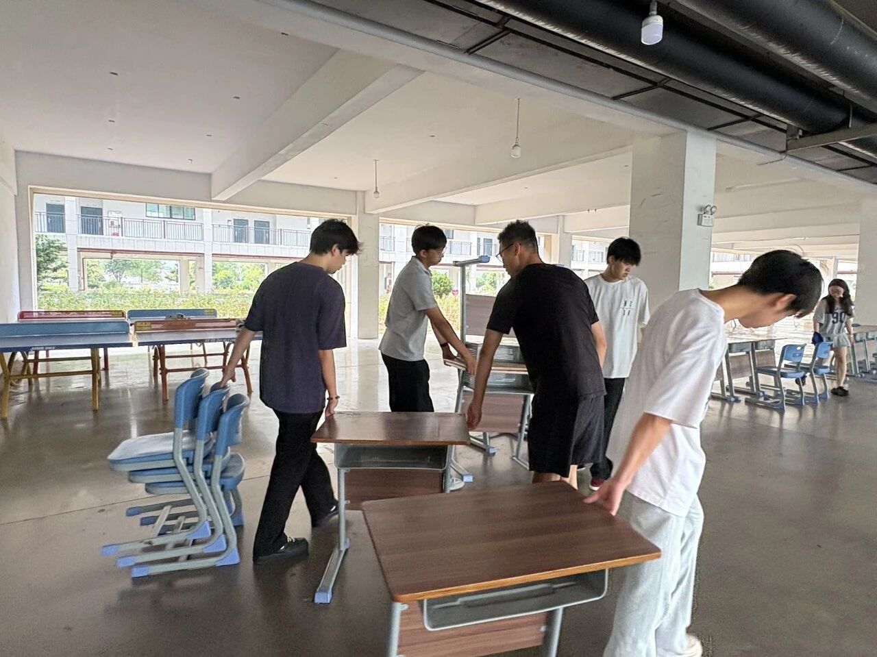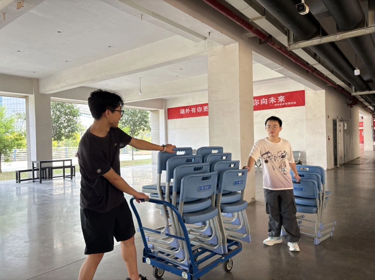交代完工作部署后迎新工作人员们正有条不紊地忙碌着,将一张张桌椅搬到指定位置,对齐、摆正,动作麻利又细心。