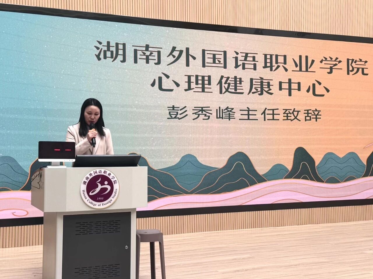 学校心理健康中心主任彭秀峰首先向全体师生致以问候。她欣喜于赛场上洋溢的热情,更欣慰于大家对心理健康的深切关注。她将心理知识比作人生的“指南针”,期盼选手们不仅在此收获知识、磨砺思维之剑,更能学会以科学之道,关照自我、温暖他人。最后,她预祝各代表队赛出风采、超越自我,并祝愿本届决赛圆满成功!