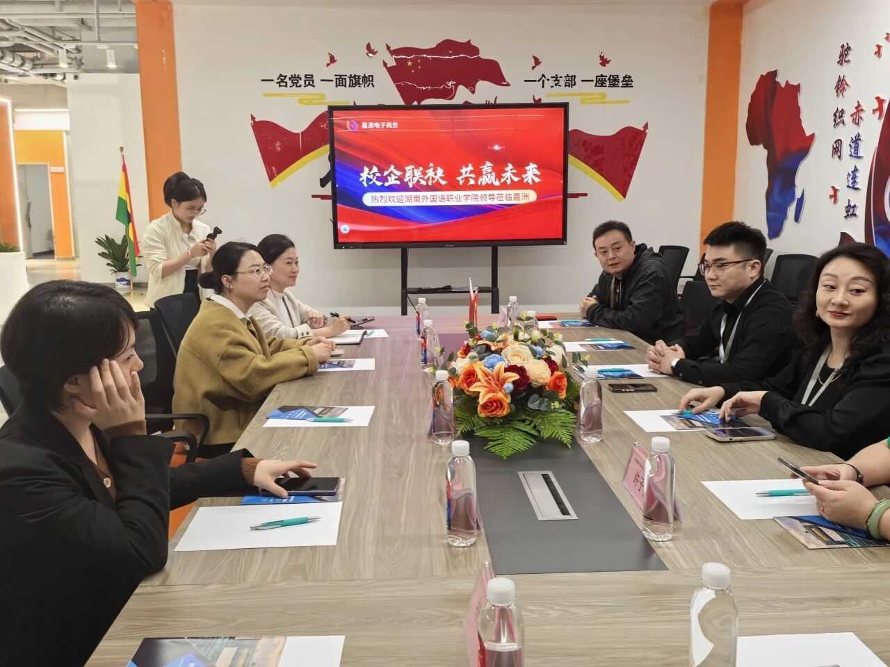 在随后举行的座谈会上,双方围绕“校企协同、共育人才”的主题进行了深入交流。刘芳院长介绍了我院在应用型人才培养方面的成果与特色,她强调:“产教融合不仅是提升人才培养质量的关键举措,更是高校服务社会的重要途径。我们希望与企业共同构建从课堂到岗位、从理论到实践的贯通式育人路径。”嘉洲电商项目负责人袁海华对此深表认同,她详细介绍了公司的业务布局与发展规划,并分析了当前经贸类毕业生在投身跨境电商领域时的优势与待提升空间。双方在愉快的交流中凝聚了共识,未来,校企将在课程内容共建、“双师型”教师培养、学生创新创业及中非市场专题研究等多个维度探索合作路径,推动合作走向实质阶段。