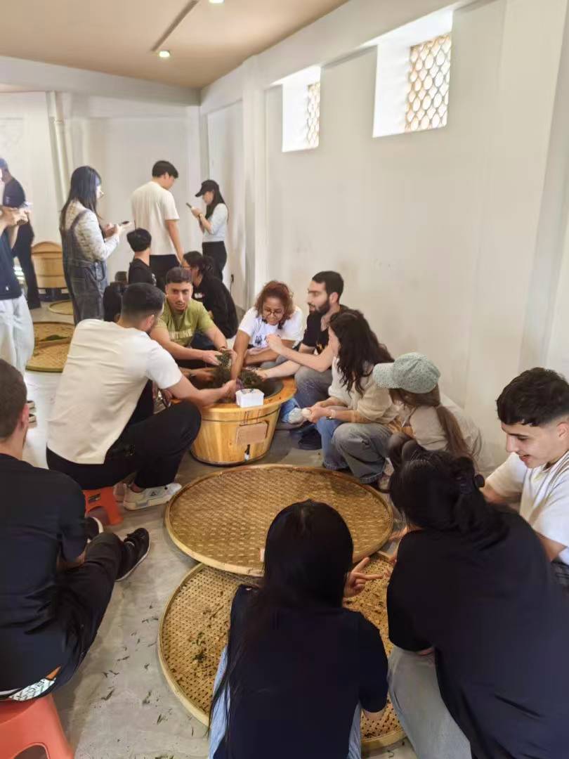 采摘后的鲜叶,即刻送往炒茶体验区。在志愿者全程指导下,大家依次体验杀青、揉捻、干燥等核心制茶工序。高温炒茶锅中,鲜叶遇热迅速失水,参与者双手快速翻炒,把控火候与力度;随后反复揉捻,让茶叶成型卷曲。随着工序推进,鲜叶逐渐褪去青涩,茶香渐渐浓郁,弥漫在整个现场。亲手参与的每一个步骤,都让大家深刻感悟到传统制茶技艺的匠心独运,读懂“慢工出细活”的劳动真谛。