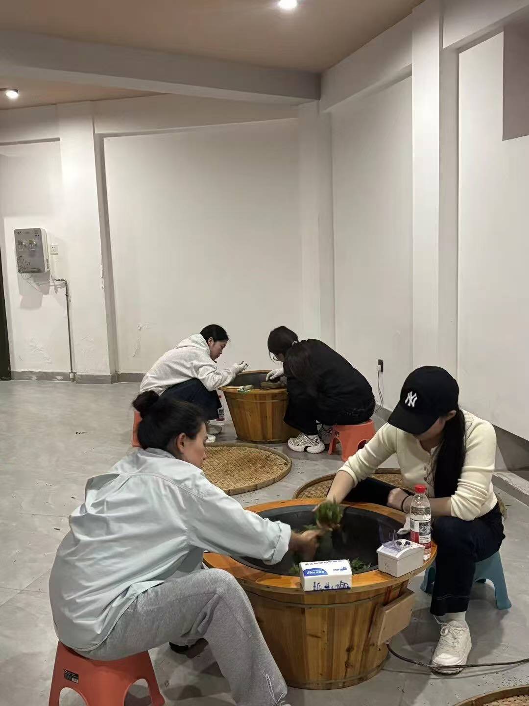 雨中茶山青翠欲滴,鲜嫩茶芽挂着点点雨珠,格外惹人喜爱。大家手持竹篮,漫步茶垄之间,指尖轻捻最鲜嫩的单芽与一芽一叶,在轻柔的采摘动作中,亲近自然、感受农耕乐趣,体会每一片茶叶的来之不易,开启茶文化实践的第一堂课。