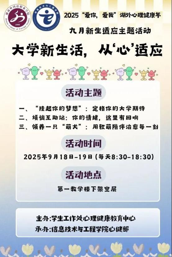 金秋九月,丹桂飘香,新的学期如约而至。为了帮助新生尽快适应大学生活,融入集体,同时缓解新老生开学焦虑,营造积极向上的校园氛围。湖南外国语职业学院学生工作处心理健康教育中心携手信息技术与工程学院,精心打造“大学新生活,从'心'适应"系列心理健康教育主题活动。让我们一同开启这场温暖的心灵之旅!