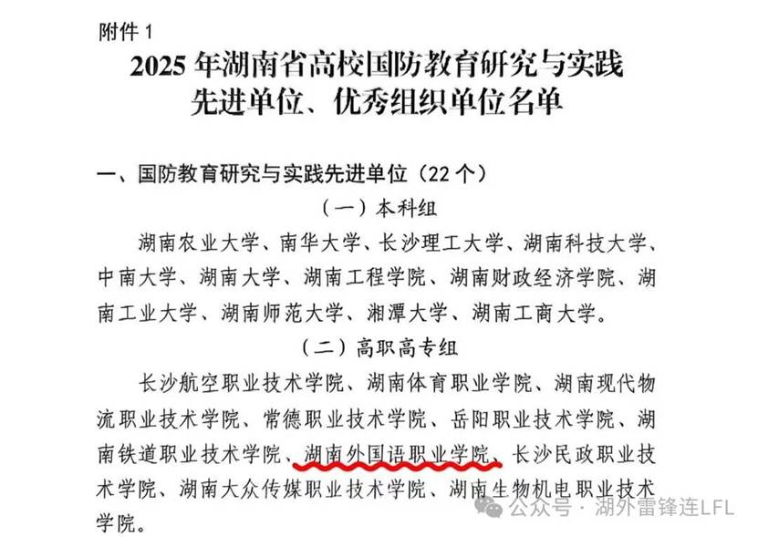 近日,湖南省高等教育学会国防教育专业委员会公布全省国防教育研究与实践先进单位评选结果,湖南外国语职业学院凭借鲜明的国防教育特色、丰硕的实践成果,成功获评该荣誉称号。