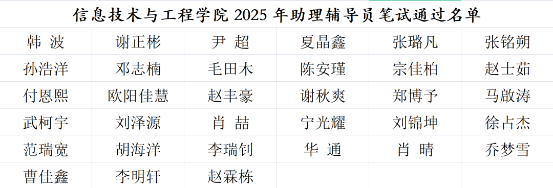 笔试为辅导员助理选拔标注关键坐标,愿候选人努力有获。后续将以饱满状态推进面试,探索提升学生工作效能之法。此次笔试为信息技术与工程学院学院辅导员助理团队注入新生力量、激活活力,为信院学子提供展示契机,筑牢学生管理工作根基。以上是笔试结果,恭喜这些同学进入面试,望在面试中突出重围!