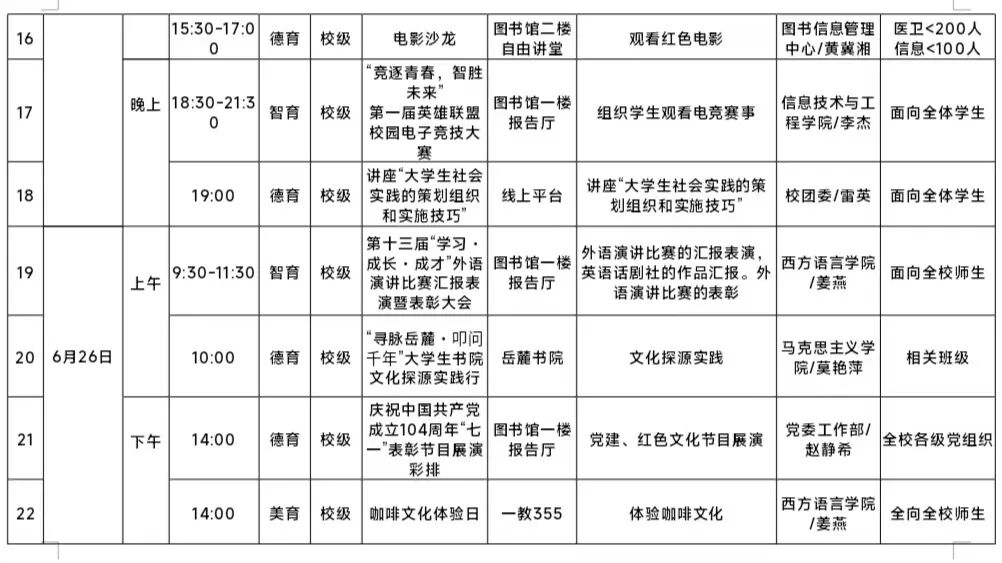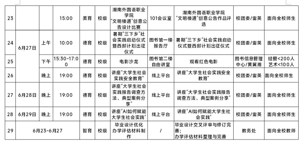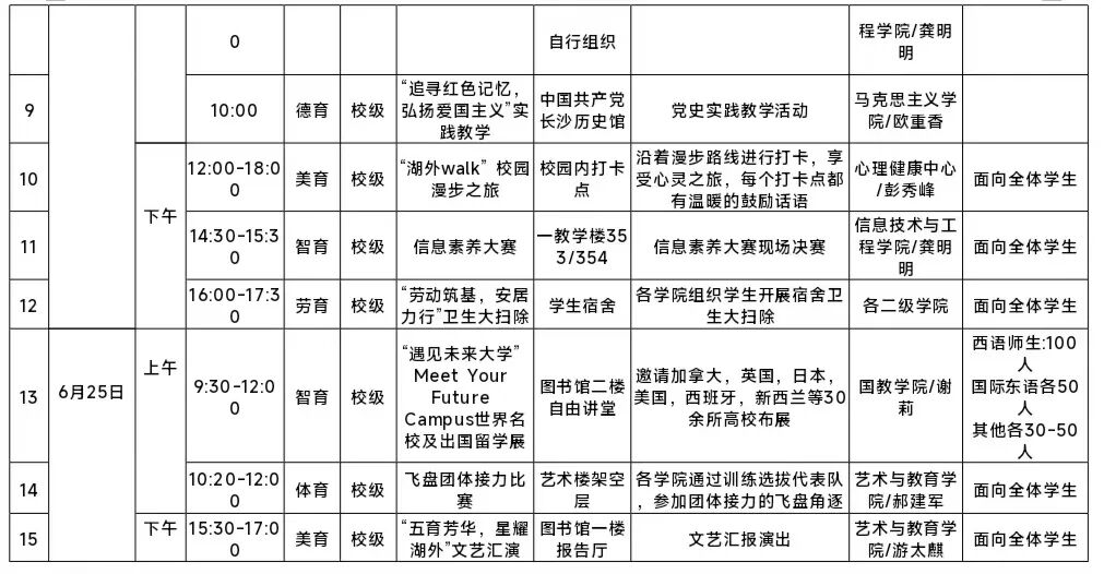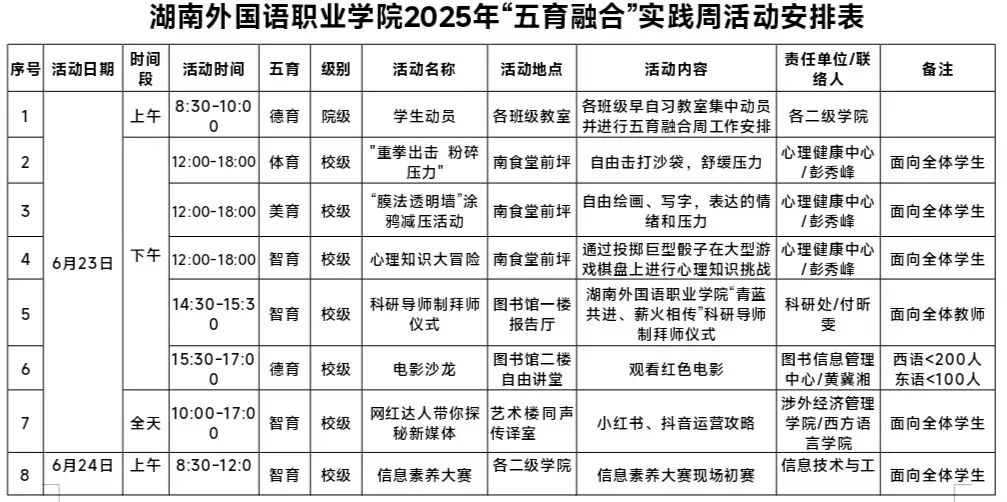 我院精心筹备并开展“五育融合”实践周活动。现将具体安排表附上,请大家仔细查阅。此次实践活动内容丰富、形式多样,涵盖德育、智育、体育、美育、劳育等多个维度,旨在让大家在多元实践中实现全面发展。请各位同学务必按照安排表上的时间和地点,提前做好准备,准时且准确无误地抵达相应区域参与实践。