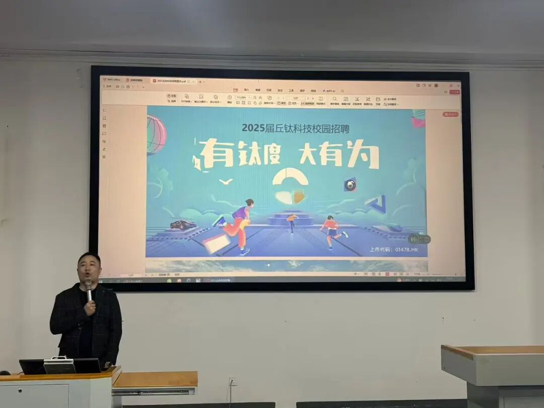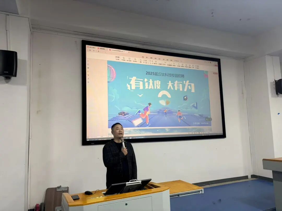为深化校企合作,助力智能视觉领域人才培养,昆山丘钛微电子科技股份有限公司与湖南外国语职业学院信息技术与工程学院于11月13日晚上18点30分在北1教学楼353教室举办校园招聘宣讲会,聚焦电子信息工程与智能制造领域的前沿人才需求。活动旨在通过“双通道”职业发展体系、定制化“理论 + 实践”培养模式及完善的校企合作生态,精准赋能学生专业技能与职业素养的双重跃升。