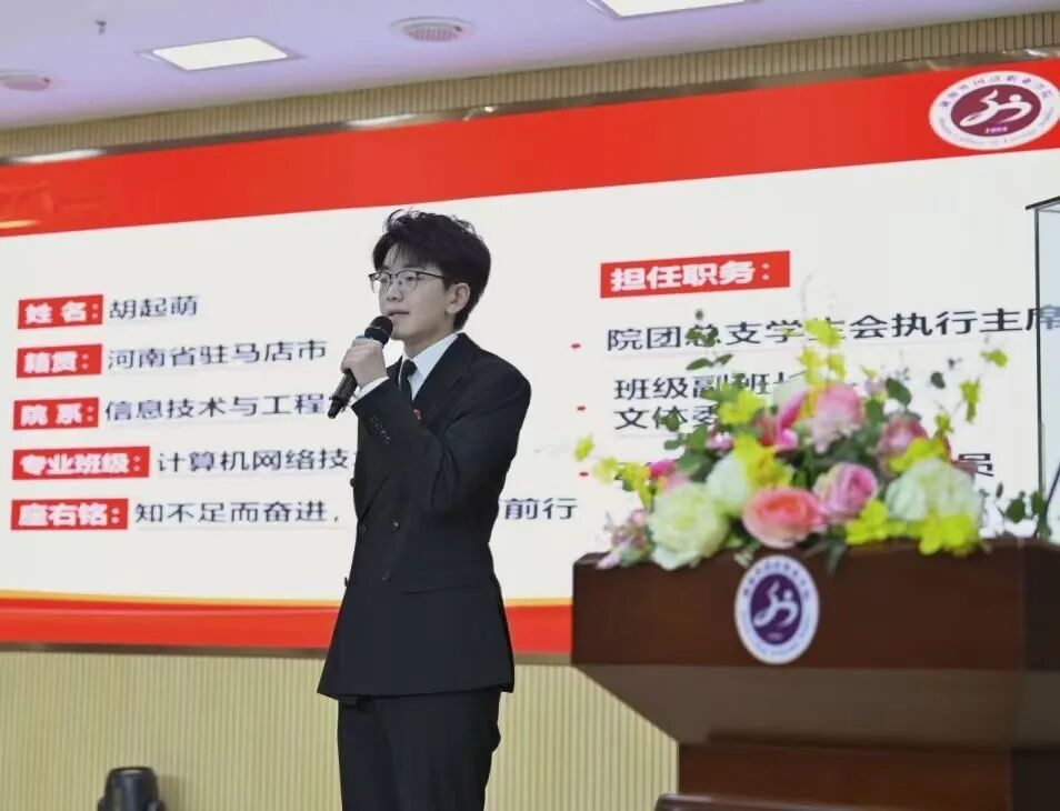 信息技术与工程学院优秀学生代表胡起萌同学以:“在挑战中破茧,于磨砺中成长”为主题以及结合自身经历分享他的蜕变之路。初入湖外时,面对自由的大学生活,迷茫无措,但通过加入学生会,积极参与职业规划大赛等活动,逐步突破自我,收获能力与荣誉;在平衡学习与工作的过程中,通过科学规划时间,成绩稳居前列,同时备考专升本;后来担任新生助辅与学生会执行主席,统筹多项校园活动,假期还运用专业知识为家乡学校搭建网络、参与志愿服务。同时他表示“我将继续传递这份温暖,与大家共勉!”