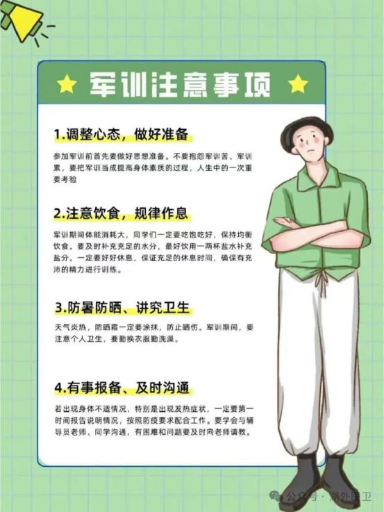 最后,军训是一次磨砺意志、锻炼自我的好机会。只要做好充分的准备,注意这些事项,就能顺利度过军训时光,为大学生活打下坚实的基础。